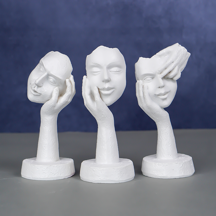 This captivating set of three white face sculptures features a minimalist design with a textured finish, creating a striking balance between simplicity and artistic expression. Each sculpture presents a unique facial expression, delicately resting on a hand, making them an intriguing addition to any contemporary or modern interior. The abstract design invites interpretation, allowing these pieces to resonate with various moods and styles.